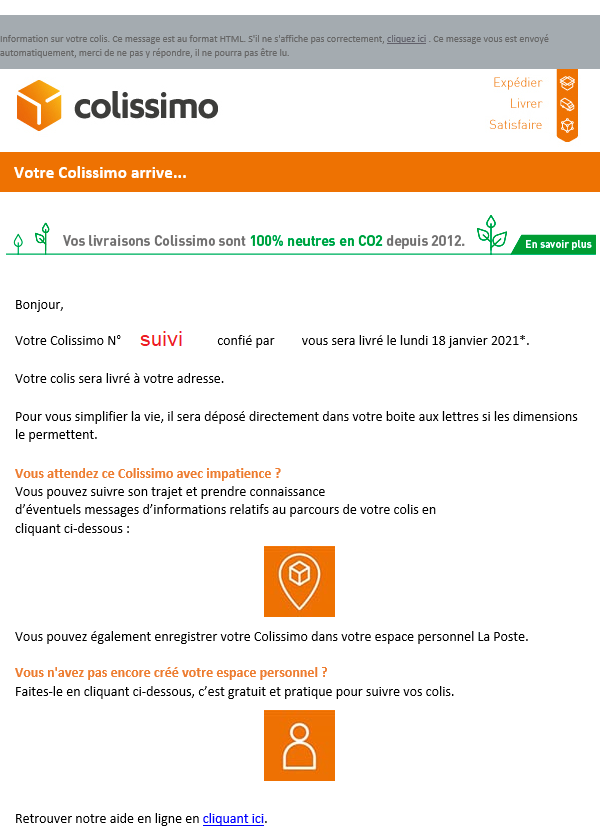Colissimo vous enverra un mail une fois le colis posté, et la veille de livraison.